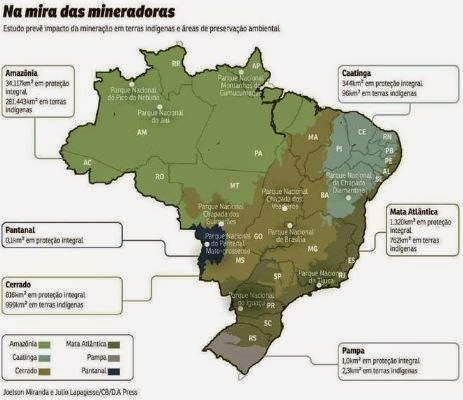 O estudo mostra que pelo menos 20% das áreas estritamente protegidas e reservas indígenas coincidem com locais que foram oficialmente registrados como de interesse para a mineração. O Projeto de Lei 3.682/2012, em tramitação na Câmara, por exemplo, prevê a exploração de minérios em até 10% da área de unidades de proteção integral. Entre as 578 terras indígenas analisadas, 251 (43%) delas têm interesse mineral. No caso de 505 áreas de proteção integral, 236 (47%) estão na mira de mineradoras. A maior parte das áreas afetadas está na Amazônia.