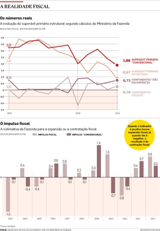Se o governo aumenta seus gastos e diminui impostos, como fez até agora a gestão Dilma Rousseff com seus diversos pacotes de medidas para tentar estimular o PIB, a política fiscal estrutural tem impulso positivo, ou expansionista. Por outro lado, se o governo corta despesas, como salários, investimentos ou benefícios sociais, e aumenta impostos, como deve fazer o governo a partir de 2015, como indicou ontem a presidente Dilma, o efeito sobre a atividade é contracionista.