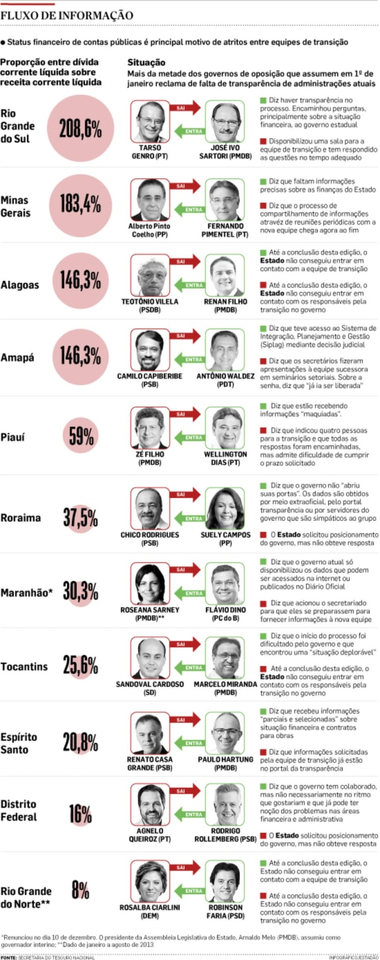Nos Estados de Minas Gerais, Maranhão, Amapá, Piauí, Roraima, Tocantins e Espírito Santo, além do Distrito Federal, coordenadores de equipes de transição dos governos eleitos reclamam que os dados passados pelas administrações estaduais não vão além daqueles que estão disponíveis nos diários oficiais e nos portais de transparência.