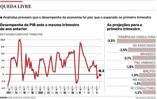 Nas projeções de bancos e consultorias, a economia deve ter uma retração de 1,2% a 3,5% entre janeiro e março na comparação com o mesmo período de 2014. Se o resultado mais pessimista for confirmado, será a mais brusca queda trimestral do PIB em bases anuais desde o primeiro trimestre de 1992. Naquela época, com o País envolvido nas denúncias de corrupção que tirariam do poder o presidente Fernando Collor de Mello, a economia brasileira encolheu 3,2% (ver quadro).