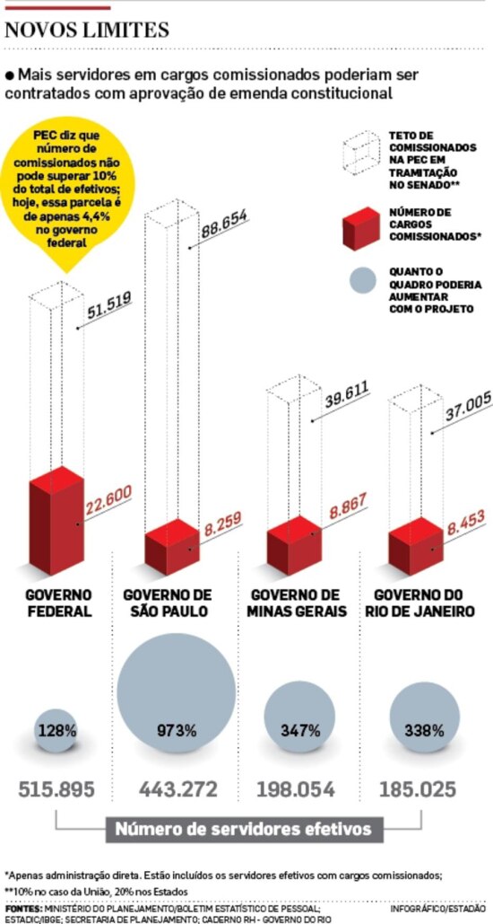 Nos governos de São Paulo, Minas Gerais e Rio de Janeiro aconteceria o mesmo. Para complicar, uma emenda do senador Antonio Anastasia (PSDB-MG) foi acolhida pelo relator da proposta, Álvaro Dias (PSDB-PR), e ampliou ainda mais o teto para Estados e municípios. Resultado: São Paulo, Minas e Rio terão limites que permitirão a ampliação do quadro de comissionados em 973%, 347% e 338%, respectivamente.