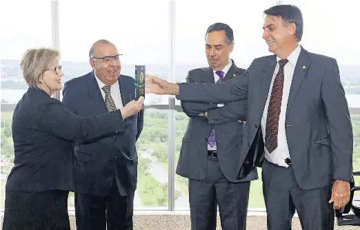 No TSE. Ao lado de Jorge Mussi (STJ) e Luís Roberto Barroso (STF), a ministra Rosa Weber entrega exemplar da Constituição a Jair Bolsonaro