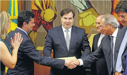 Uma comitiva de ministros acompanhou Moro na apresentação do projeto ao presidente da Câmara, Rodrigo Maia (DEM-RJ). Entre eles, Paulo Guedes (Economia), Damares Alves (Mulher, Família e Direitos Humanos), Luiz Mandetta (Saúde), Santos Cruz (Secretaria de Governo). A presença deles, segundo Moro, se deu “para demonstrar coesão do governo quanto ao projeto”.