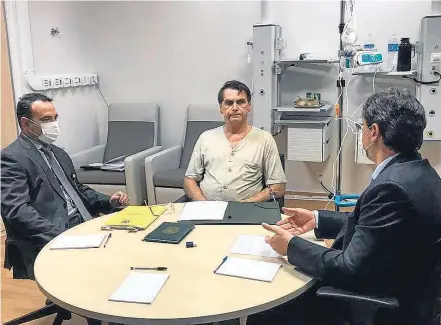 Hospital. Em gabinete improvisado, Bolsonaro recebe o ministro da Infraestrutura, Tarcísio Gomes de Freitas (à dir.)