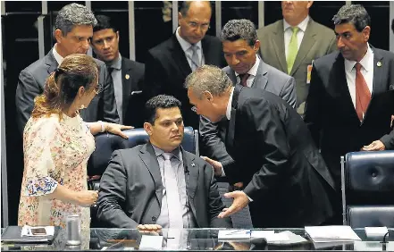 Embate. Acompanhado por Katia Abreu, Renan Calheiros discute com Davi Alcolumbre (sentado) na sessão de ontem