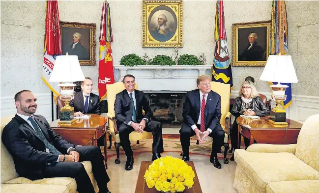 Os presidentes Jair Bolsonaro e Donald Trump se encontram no Salão Oval da Casa Branca, ao lado dos dois intérpretes oficiais e na presença de Eduardo (E)