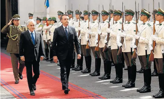 Alinhamento. Bolsonaro foi recebido ontem por Piñera com honras militares no Palácio La Moneda, sede do governo chileno. Em seu discurso, ELE se comprometeu a comparecer à COP-25, que será realizada no Chile, mas disse que o Brasil pode não aderir a acordos que serão firmados na conferência climática. “Não podemos assinar um acordo que não podemos cumprir. O Brasil não deve nada a ninguém em termos de preservação do meio ambiente. Temos esta preocupação, mas também a preocupação com o desenvolvimento”, disse./ COLABOROU JULIA LINDNER