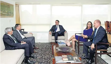 Reunião. Bolsonaro com os ministros Onyx Lorenzoni (à dir.) e Augusto Heleno (1º à esq.) e parlamentares do Podemos