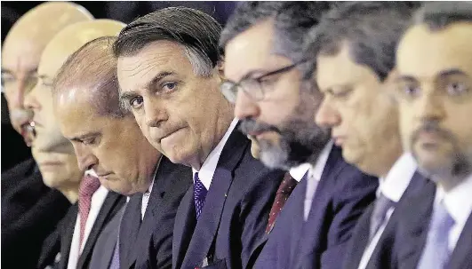 Cerimônia. Bolsonaro com ministros: apenas Paulo Guedes (Economia) e Santos Cruz (Secretaria de Governo), ambos no exterior, não compareceram