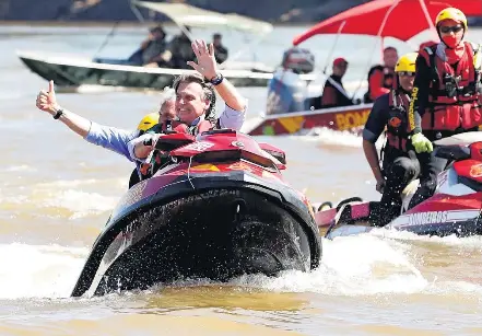 Com o aliado Ronaldo Caiado (DEM) na garupa, Jair Bolsonaro pilotou ontem uma moto aquática pelo Rio Araguaia, no trecho que divide a cidade de Aragarças (GO) – onde o presidente cumpriu agenda – de Barra do Garças (MT). De colete salva-vidas e com um bombeiro atrás para garantir que o equipamento não virasse na água, Bolsonaro demonstrou habilidade ao manobrar para distribuir acenos e sorrisos ao público que assistia a tudo da margem. A “voltinha” durou cerca de dois minutos.