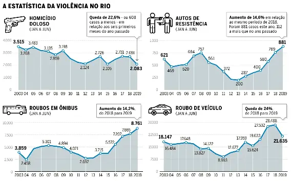 Em contrapartida, as mortes em confrontos com agentes de segurança aumentaram 14,6% entre janeiro e junho deste ano. Foram 881 casos, 112 a mais que no mesmo período do ano passado, resultado da política de enfrentamento adotada pelo atual governo. O total é o mais elevado desde 2003, início da série histórica disponível no site do Instituto de Segurança Pública do Rio. Ao levar em consideração apenas o mês de junho, houve uma pequena queda: de 155 registros, em 2018, para 150 no mês passado. Criticado por grupos de direitos humanos por causa do aumento das mortes de civis em operações policiais, o governador reagiu: