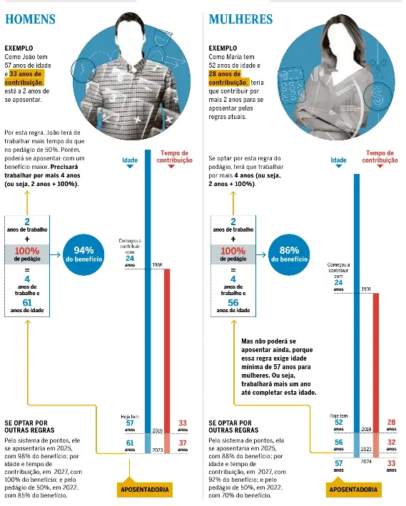 No infográfico ao lado, é apresentada a versão correta de simulações, publicadas de forma equivocada na edição impressa do GLOBO de ontem, sobre a aposentadoria pela regra do pedágio de 100%.