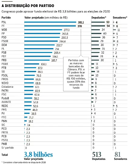 Partidos com as duas maiores bancadas da Câmara, PSL e PT ficarão com a maior parte do fundo eleitoral de 2020, que pode ser fixado em R$ 3,8 bilhões. Juntas, as duas legendas receberão quase R$ 760 milhões, se o montante for aprovado pelo Congresso, segundo levantamento do GLOBO, o equivalente a 20% dos recursos.