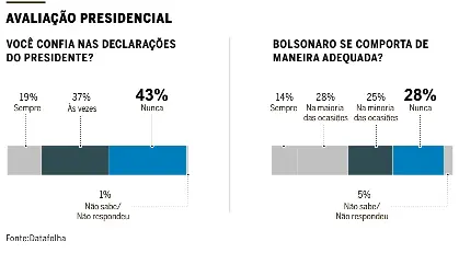 Pesquisa divulgada ontem pelo Datafolha indica que 43% dos entrevistados nunca confiam em afirmações do presidente Jair Bolsonaro, enquanto 37% disseram confiar às vezes. A margem de erro é de dois pontos percentuais, para mais ou para menos. Desde o início do mandato, declarações de Bolsonaro têm sido contestadas por organizações e figuras públicas.