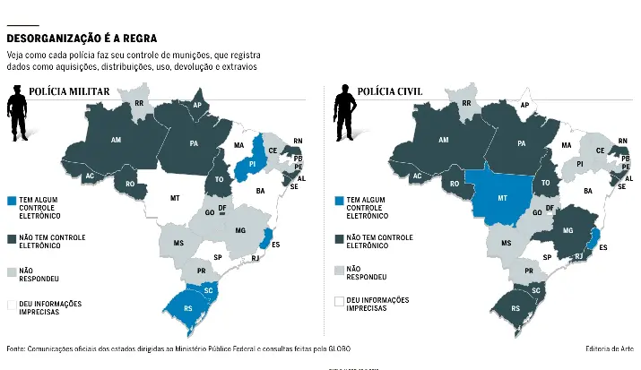As polícias militares de dez governos afirmaram não ter controle eletrônico das munições, sete unidades da federação se negaram a responder aos questionamentos e seis deram informações vagas sobre os métodos de controle. Apenas quatro estados —Piauí, Rio Grande do Sul, Espírito