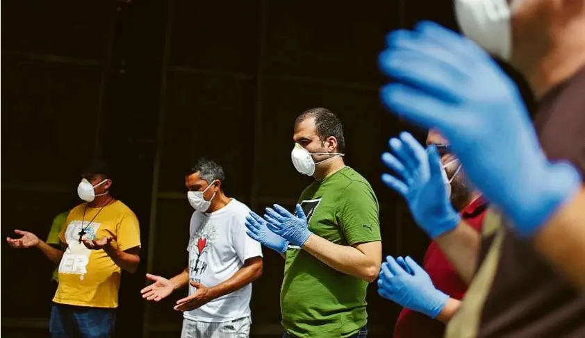PILAR OLIVARES/REUTERSFé. Voluntários fazem oração em frente à Catedral de São Sebastião, no Centro, antes de iniciarem uma distribuição de alimentos para a população de rua no Domingo de Páscoa, em ação organizada pela Arquidiocese do Rio de Janeiro