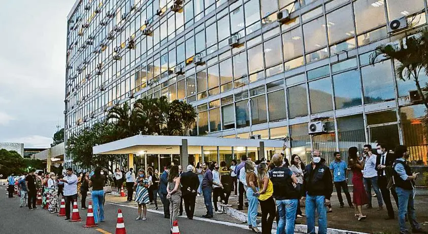 AGÊNCIA O GLOBOProtesto. Servidores do Ministério da Saúde descem de seus andares, usando máscaras, para cobrar a permanência do ministro Luiz Henrique Mandetta no cargo. Naquele momento, a demissão era considerada certa no comando do governo