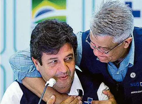 EDU ANDRADE/FATOPRESSDupla. Mandetta é abraçado pelo secretário de Vigilância, Wanderson de Oliveira, na sua despedida