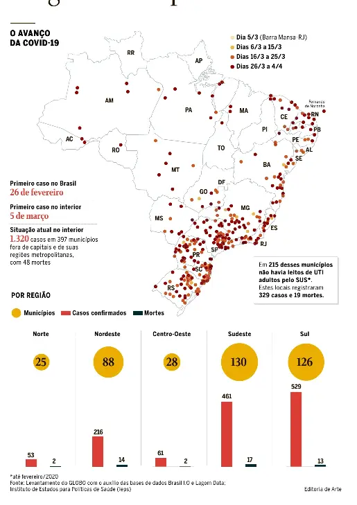 A interiorização do vírus aparece com mais força no Sul e no Sudeste, que tinham 256 cidades com casos confirmados até a manhã de ontem. Nessas regiões, sete a cada dez municípios com registros da Covid-19 não estão na região metropolitana nem nas capitais.
