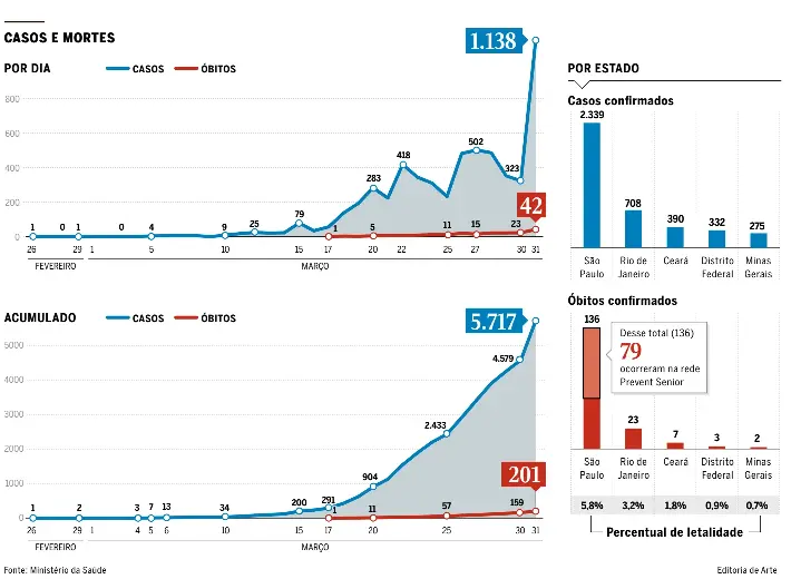 Ministério da Saúde informou que, em apenas 24 horas, haviam sido confirmados 1.138 novos casos de contaminação, que já atingiu 5.717 pessoas. O número de mortos também cresceu de forma acelerada, chegando a 42 em um dia —já são 201 vítimas fatais desde o primeiro falecimento pela Covid-19 no país, há exatos 15 dias.