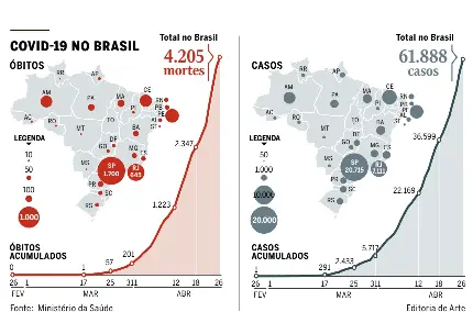O Ministério da Saúde informou ontem que o SarsCoV-2 já infectou 61.888 pessoas no Brasil, matando 4.205 delas. A letalidade — proporção de pessoas mortas em relação às que pegaram o vírus —é de 6,79%.