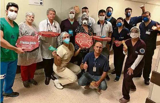ARQUIVO PESSOAL/CAROLINE AGUIARAlívio na tensão. Profissionais do Hospital Lourenço Jorge, na Barra, recebem doações de lanches que voluntária consegue em pizzarias e restaurantes