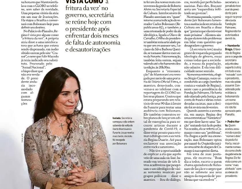 No Palácio do Planalto, Regina é vista por alguns como “a fritura da vez”. A própria atriz disse a uma interlocutora que achava que estava sendo dispensada, em áudio obtido ontem pelo site “Crusoé”, e ouve que Edir Macedo já teria indicado seu substituto. Procurado pelo “Jornal Nacional”, o bispo disse que não era verdade. O presidente andaria incomodado com algumas nomeações que ela pretendia fazer de pessoas associadas à esquerda pelos militantes bolsonaristas. Aliados dele disseram ao GLOBO, entretanto, que Bolsonaro não estaria disposto a arcar com o desgaste da demissão da atriz neste momento, após as saídas de dois ministros populares de seu governo (Sergio Moro, da Justiça, e Luiz Henrique Mandetta, da Saúde).