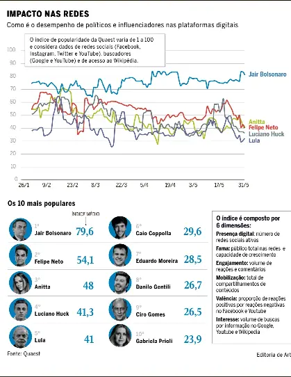 O levantamento aponta que Bolsonaro somou, no período, o maior índice médio de popularidade e liderou o ranking em cinco das dimensões analisadas. A exceção é o critério capacidade decrescimento nas redes (fama), liderado por Anitta. No quesito engajamento, Bolsonaro foi seguido de perto por Felipe Neto. Quando considerada a proporção entre reações positivas e negativas, Bolsonaro empata com o apresentador de TV Luciano Huck. O ex-presidente Lula aparece em 5º lugar no ranking, enquanto Ciro Gomes ficou na 9ª posição. (veja infográfico ao lado).