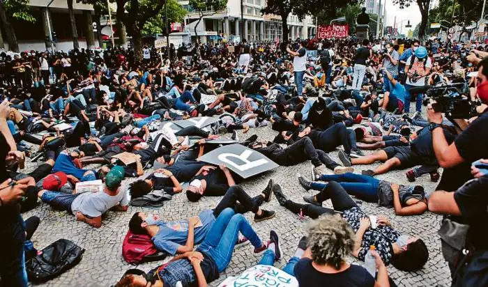 ALEXANDRE CASSIANONas ruas. No Rio, manifestantes deitaram no chão próximo à Candelária em ato antirracismo, pela democracia e contra governo Bolsonaro. Atuação violenta da polícia nas favelas foi pauta do protesto