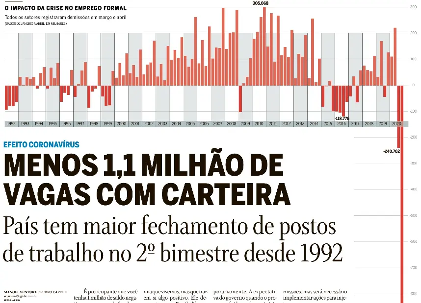 O Brasil fechou 1,1 milhão de postos de trabalho com carteira assinada nos meses de março e abril. Foi a maior destruição de empregos formais em um segundo bimestre desde o início da série histórica, em 1992. É também o primeiro retrato do impacto nas vagas com direitos trabalhistas causado pela pandemia do coronavírus.