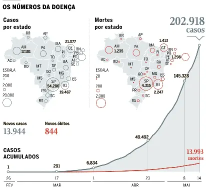 De acordo com balanço do Ministério da Saúde, o país tem 202.918 casos confirmados da doença e 13.993 mortes. Entre quarta-feira e ontem, o Brasil bateu mais um recorde no número de casos em 24 horas: 13.944. O número de mortes também foi alto neste período: 844, o segundo maior desde o início da epidemia. No mundo, as mortes já passam de 300 mil.