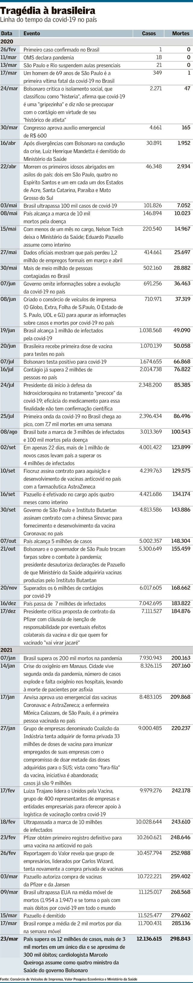 Em 24 horas, o número de mortes chegou a 3.158 (até 20h de ontem), segundo o consórcio de veículos de imprensa. Com isso, desde a chegada da pandemia, o país soma 298.843 mortes pela doença. A média móvel de óbitos foi de 2.349, também recorde, com crescimento de 49% ante à semana móvel anterior. A média de mortes bate recordes há 25 dias seguidos, desde 27 de fevereiro.