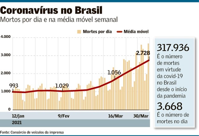 O Brasil chegou ontem a um novo recorde de mortes por covid-19 em 24 horas: 3.668. Subiu para 317.936 as vidas perdidas no país em decorrência da doença. A média foi de 2.728 óbitos por dia na semana móvel, também um recorde - o quinto consecutivo. A média aumentou 34% em relação à semana móvel anterior. Os números foram apurados pelo consórcio de veículos de imprensa.